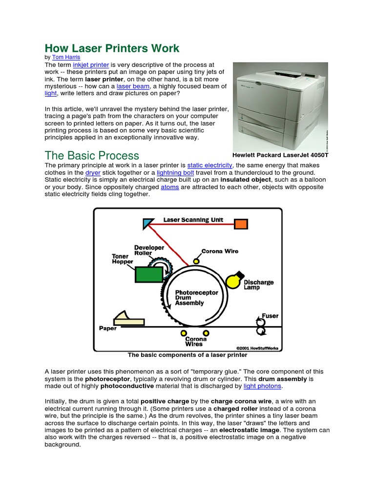 The static electricity attracts onto the page a kind of powdered ink called toner. The current laser printers you see today were created by gary starkweather. The primary principle at work in a laser printer is static electricity, the same energy that makes clothes in the dryer stick together or a lightning bolt travel from a thundercloud to the ground. The images that are created by inkjet printers are by spraying minute or small dots of ink in the paper. First, a negative charge is applied to a cylindrical drum by a primary charge roller or corona wire. The laser beam is turned on and off in accordance with the image to be created on the drum. The drum rolls the toner onto the paper in the form of your print. However, in contrast to inkjets, dot matrix printers employ an impact 'head and ribbon' method of printing. Inkjet printers are a familiar sight in homes and offices, used to print homework, newsletters and photos for the family or quotes, invoices, forms and colour business. A laser printer is one of the most ingeniously designed electronic devices, whose working is based on the xerography or electrophotography. Their are kw level drivers available in pulsed and qcw mode versions. Initially, most commercial laser printers were limited to monochrome printing (black writing on white paper). How do wireless printers work?